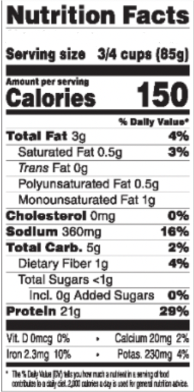 Ingredients: Water, Soy Protein, Wheat Gluten, Natural Flavours, Avocado Oil, Potato Starch, 2% Or Less Of Pea Fiber, Potassium Salt, Yeast Extract, Onion Powder, Salt, Spices, Garlic Powder. Contains: Wheat, Soy.
