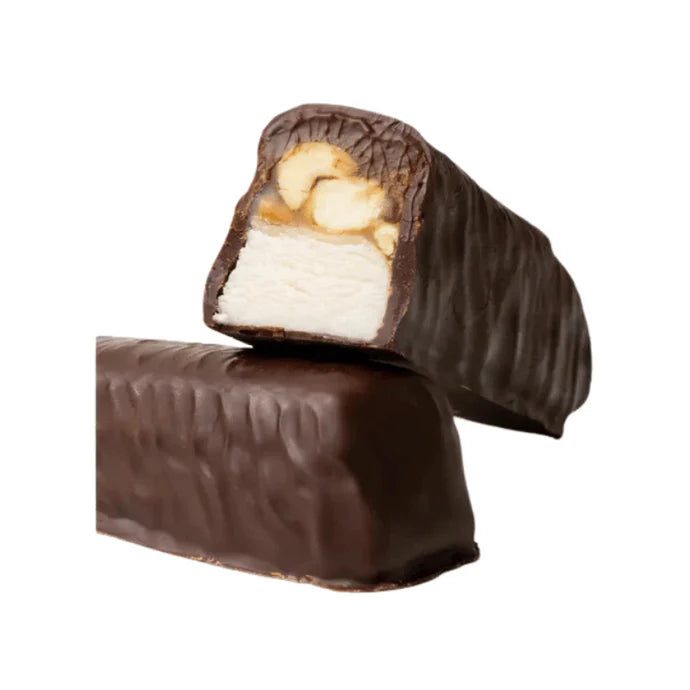 Ingredients: Sugar, Light Corn Syrup(corn syrup, salt vanilla), Unsweetened Chocolate(sugar, cocoa butter, soy lecithin, vanilla), Evaporated Coconut Milk(coconut cream, filtered water), Coconut Sugar, Guar Gum, Sea Salt, Peanut Butter(peanut oil, salt), Brown Sugar, Aquafaba(chickpea water), Sea Salt, Peanut Butter(peanuts, salt), Vanilla Extract(water, alcohol(35%), sugar, vanilla bean extractives), Agar Powder. Allergens: Peanuts, Soy, Coconut, (Made on equipment that processes pecans).