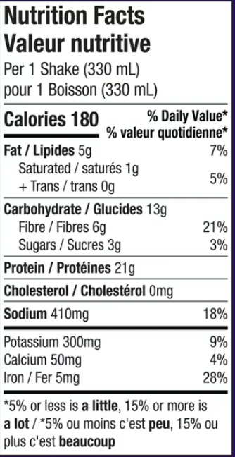 Ingredients: Water, Hydrolyzed pea protein, Soy protein isolate, Oligofructose (soluble fibre), Cane sugar, Cocoa powder (processed with alkali), Vegetable oil, Sea salt, Dipotassium phosphate, Stevia leaf extract, Gellan gum, Rosemary extract, Natural flavours. Contains: Soy.