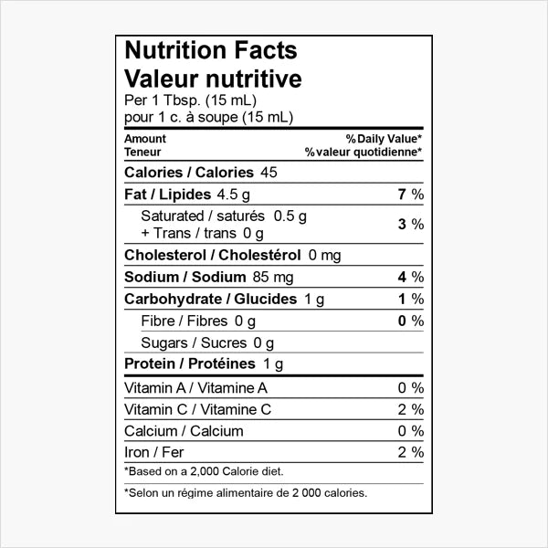 Ingredients: *Cold-Pressed Extra Virgin Olive Oil, Filtered Water, *Unfiltered Apple Cider Vinegar, *Lemon Juice, *Hemp Seeds, *Coconut Sugar, Nutritional Yeast, *Minced Garlic, *White Chia Seeds, *Minced Onion, Grey Sea Salt, *Red Bell Pepper, *Parsley, *Black Pepper, *Green Banana Flour, *Dill. *Organic. May Contain Sesame.